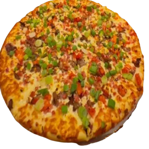 Garlic olive oil, cheese, steak meat,bacon crumble,diced tomatoes,goat cheese, Oregano,drizzle of garlic olive oil, after oven add green onions